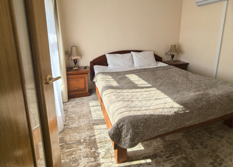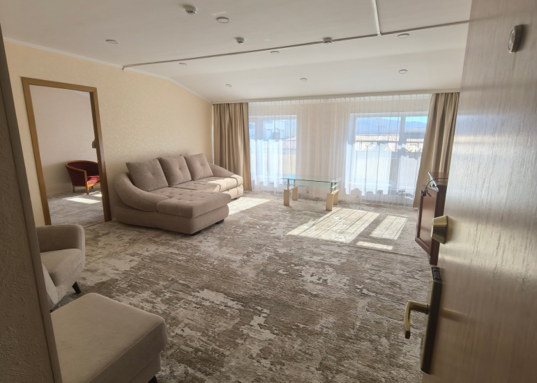 Delux suite(3 номера) - Просторные, светлые номера с гостиной, кабинетом, кухней и спальней площадью до 80 м² оснащен всеми современными удобствами: большой комфортной кроватью, мягким уголком кабельным телевидением, сейфом, холодильником. Кровать 180*200, доп. место - двуспальный диван. Возможно двухместное размещение.