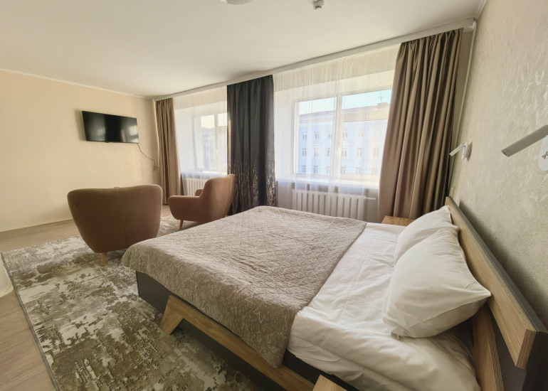 Просторные, светлые номера с балконом. Гостиная, ванная комната, спальня. Номер оснащен всеми современными удобствами: большой комфортной кроватью, мягким уголком кабельным телевидением, сейфом, холодильником. Номер удачно подойдет, как для работы, так и для проведения различных мероприятий - романтическое свидание или проведение переговоров. В Вашем распоряжении: зона отдыха, гостиная, джакузи, душ. Панорамный вид на центральную улицу города Читы.