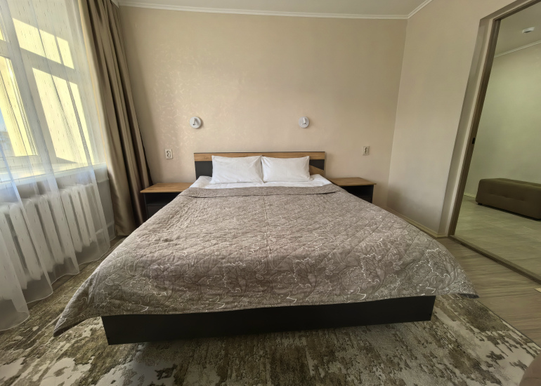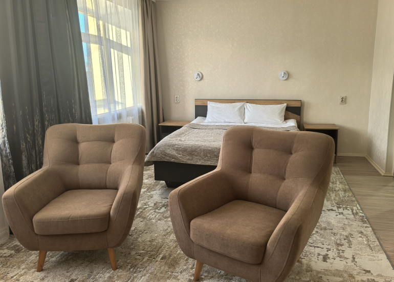 Deluxe(3 номера) - Просторные, светлые номера с гостиной, кабинетом, и спальней площадью до 65 м² оснащен всеми современными удобствами: большой комфортной кроватью, мягким уголком кабельным телевидением, сейфом, холодильником и тд.