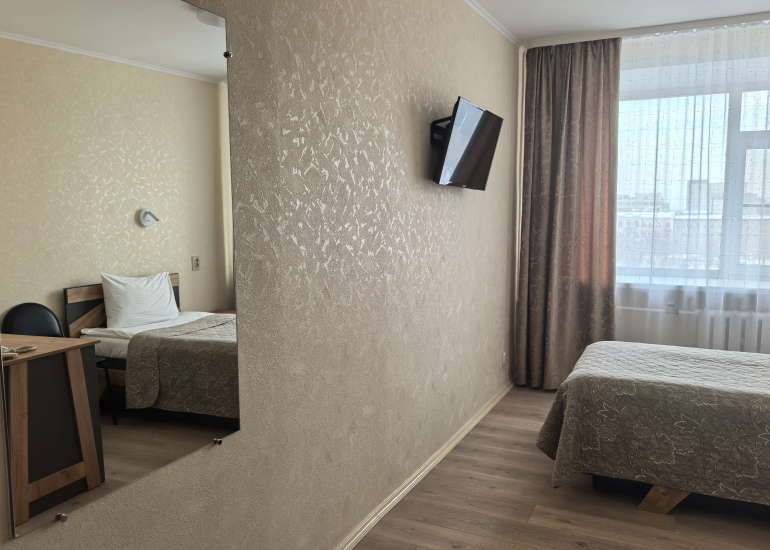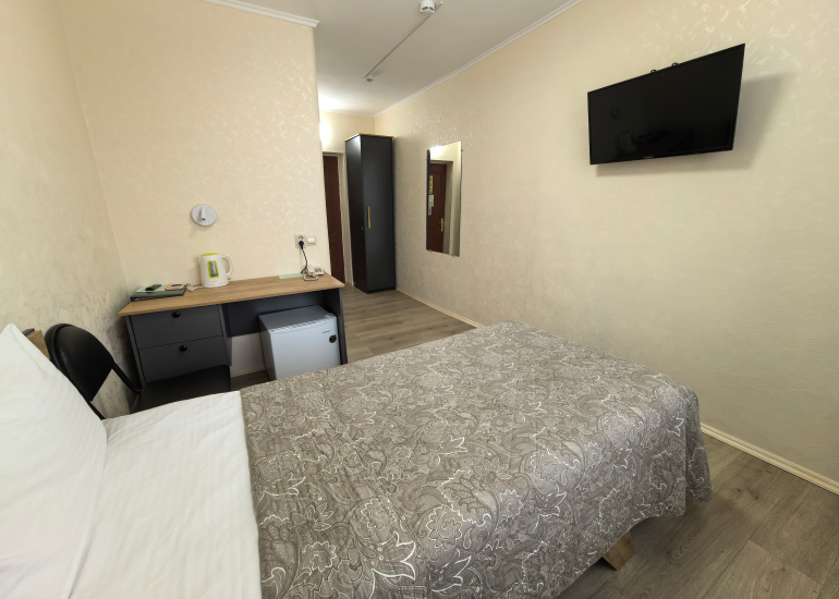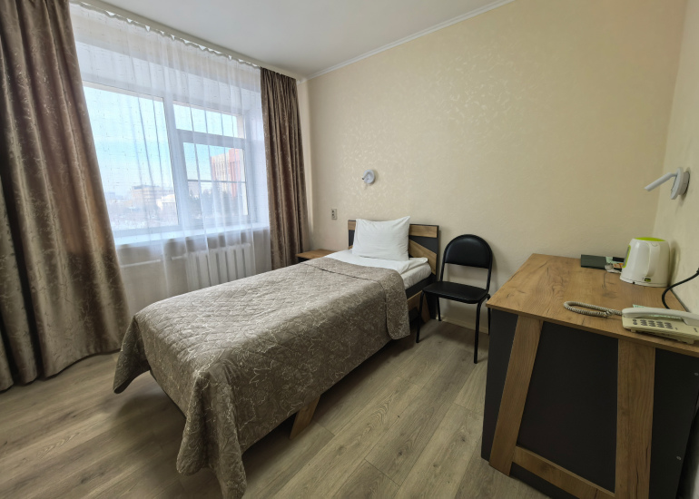 Стандартные одноместные номера с классическим набором мебели - одноместная кровать, тв, холодильник, письменный стол, шкаф для одежды.