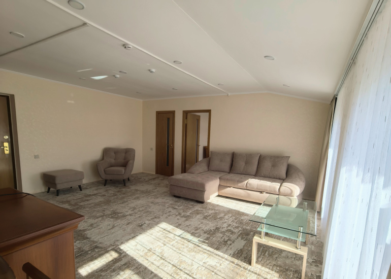 Delux suite(3 номера) - Просторные, светлые номера с гостиной, кабинетом, кухней и спальней площадью до 80 м² оснащен всеми современными удобствами: большой комфортной кроватью, мягким уголком кабельным телевидением, сейфом, холодильником. Кровать 180*200, доп. место - двуспальный диван. Возможно двухместное размещение.